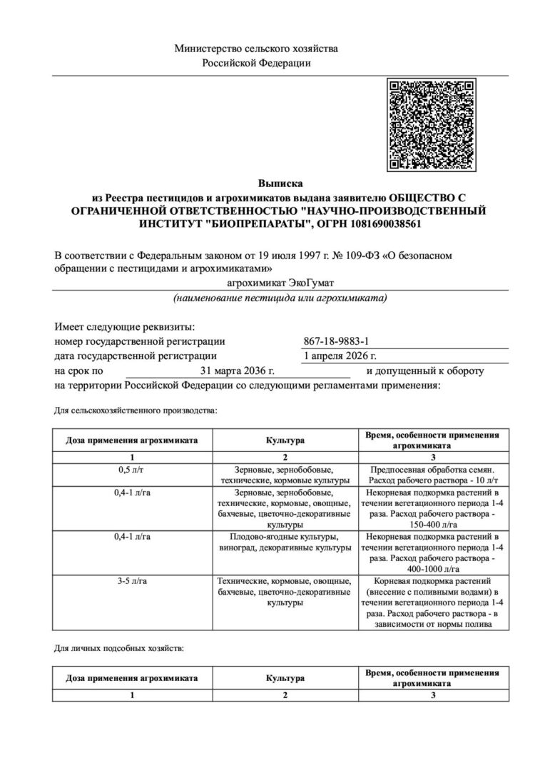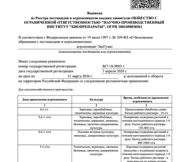 ЭкоГумат зарегистрирован в Государственном каталоге пестицидов и агрохимикатов, разрешенных к применению на территории Российской Федерации. Номер государственной регистрации 867-18-9883-1 от 1 апреля 2026 г.